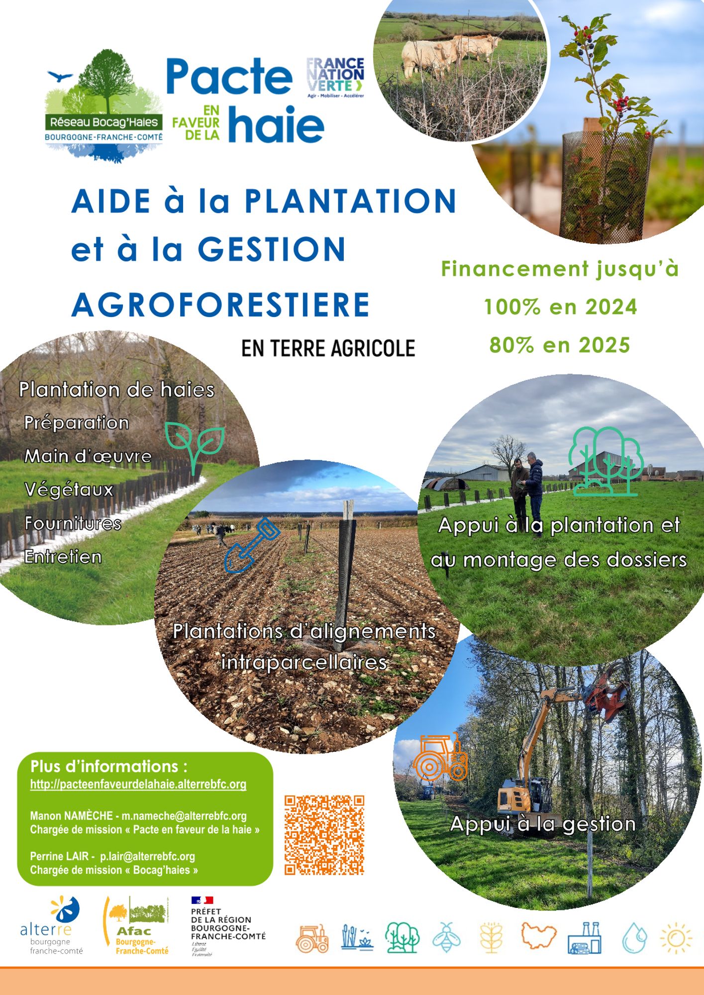Lancé par le Ministère de l’agriculture et de la souveraineté alimentaire en septembre 2023, le pacte en faveur de la haie fait partie du plan d’action France Nation verte. Il succède au plan de relance et vise à financer la plantation et la gestion des haies en Bourgogne-Franche-Comté. L'objectif est d'augmenter le linéaire de haie et d’agroforesterie intraparcellaire de 440 km nets par an en terres agricoles jusqu’en 2030.