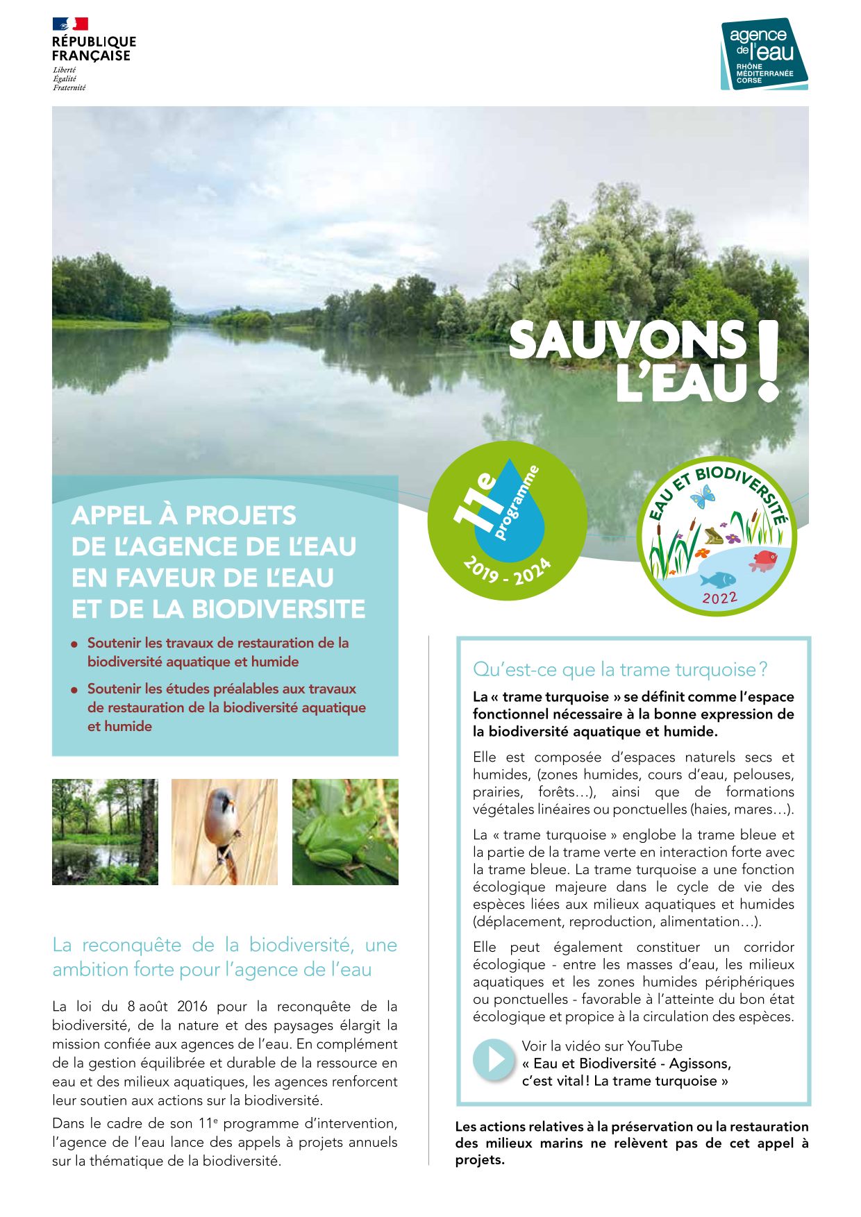 Dans le cadre de son 11e programme d’intervention, l’agence de l’eau Rhône-Méditerranée-Corse lance des appels à projets annuels sur la thématique de la biodiversité. L'appel à projet Eau et biodiversité vise à soutenir les projets de restauration de la biodiversité aquatique et humide et les études préalables aux travaux de restauration.