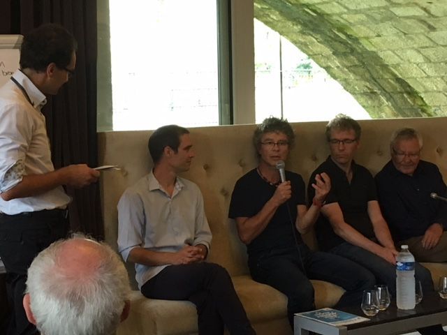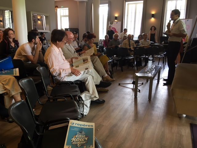 Après un déjeuner en terrasse de l'espace Louis Pasteur, le long du canal, les participants à l'assemblée générale d'Alterre se sont retrouvés autour de la thématique de l'impact du changement climatique sur la ressource en eau et de l'adaptation. Il s'agissait d'un atelier participatif auquel étaient conviés deux chercheurs qui ont contribué au projet de recherche-action HYCCARE Bourgogne - Yves Richard du Centre de recherche de climatologie et Philippe Amiotte-Suchet du laboratoire Biogeosciences - , ainsi que le conseiller municipal de Semur-en-Auxois, Pierre Libanori, et le coordonnateur des bassins Tille et Bèze à l'EPTB Saône et Doubs, Julien Moreau. Tous les quatre ont témoigné dans le n°73 de Repères "Impacts climatiques : quelle eau pour demain ?". L'idée était d'offrir l'opportunité aux participants d'échanger, de partager leurs questionnements, leur vécu afin de faire émerger des pistes d'adaptation au changement climatique.