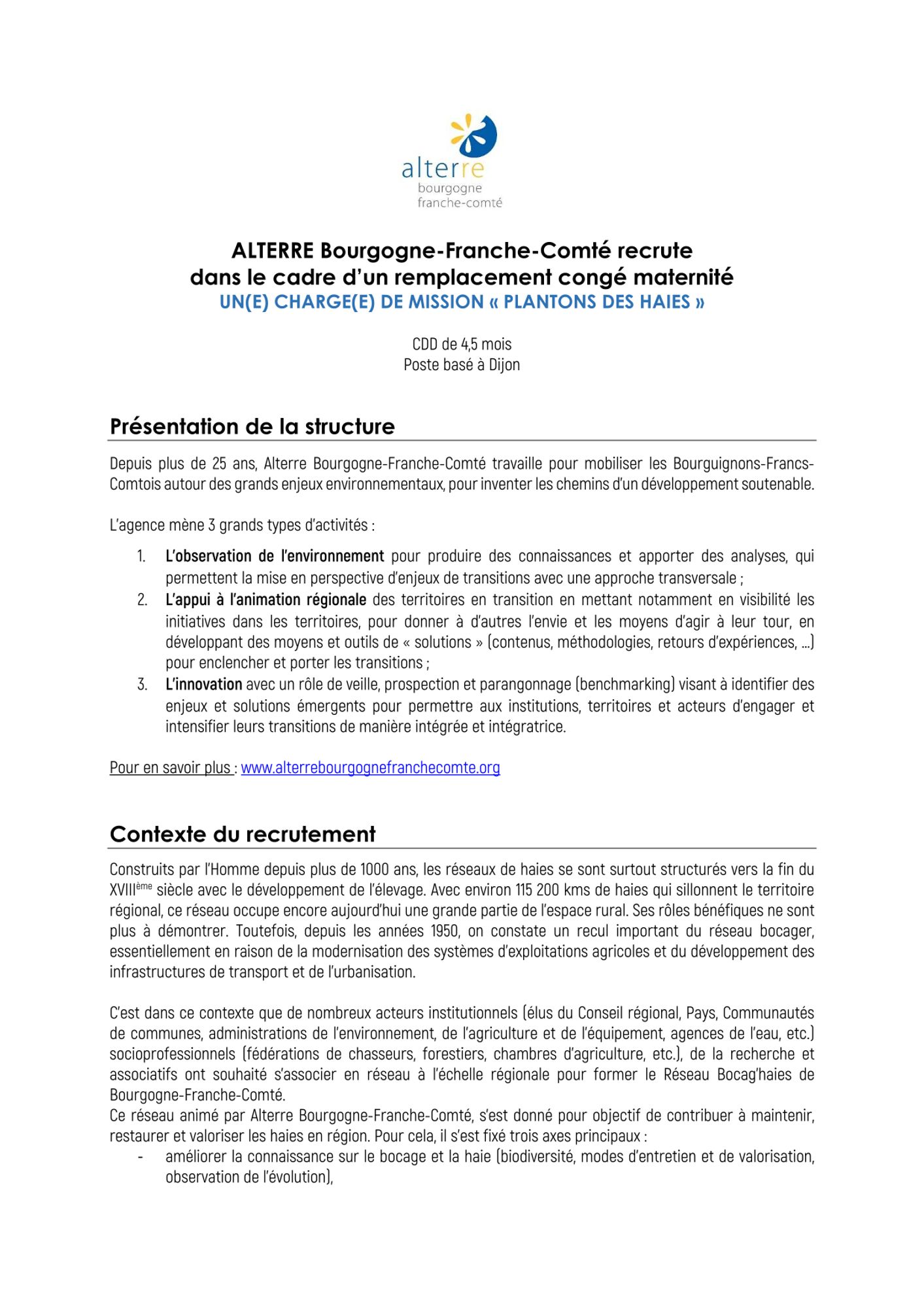 Dans le cadre d’un appel à projet régional du plan de relance, la Direction régionale de l’Agriculture, de l’Alimentation et de la Forêt a confié à Alterre, la mission de coordination et d’animation du dispositif « Plantons des haies » du plan « France Relance ». Cette mission s’articule avec les activités courantes d’animation du Réseau Bocag’Haies de Bourgogne-Franche-Comté.