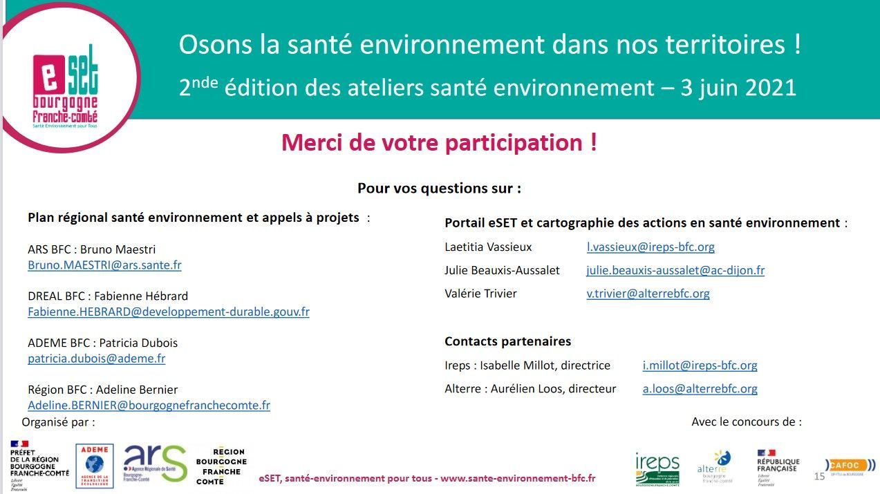 Dans le cadre du troisième Plan régional santé-environnement (PRSE3), l’ARS, la Région, l’ADEME et la DREAL Bourgogne-Franche-Comté ont organisé la seconde édition des ateliers de la santé-environnement, le 3 juin 2021 matin, en collaboration avec l’Ireps, Alterre et le Cafoc.
