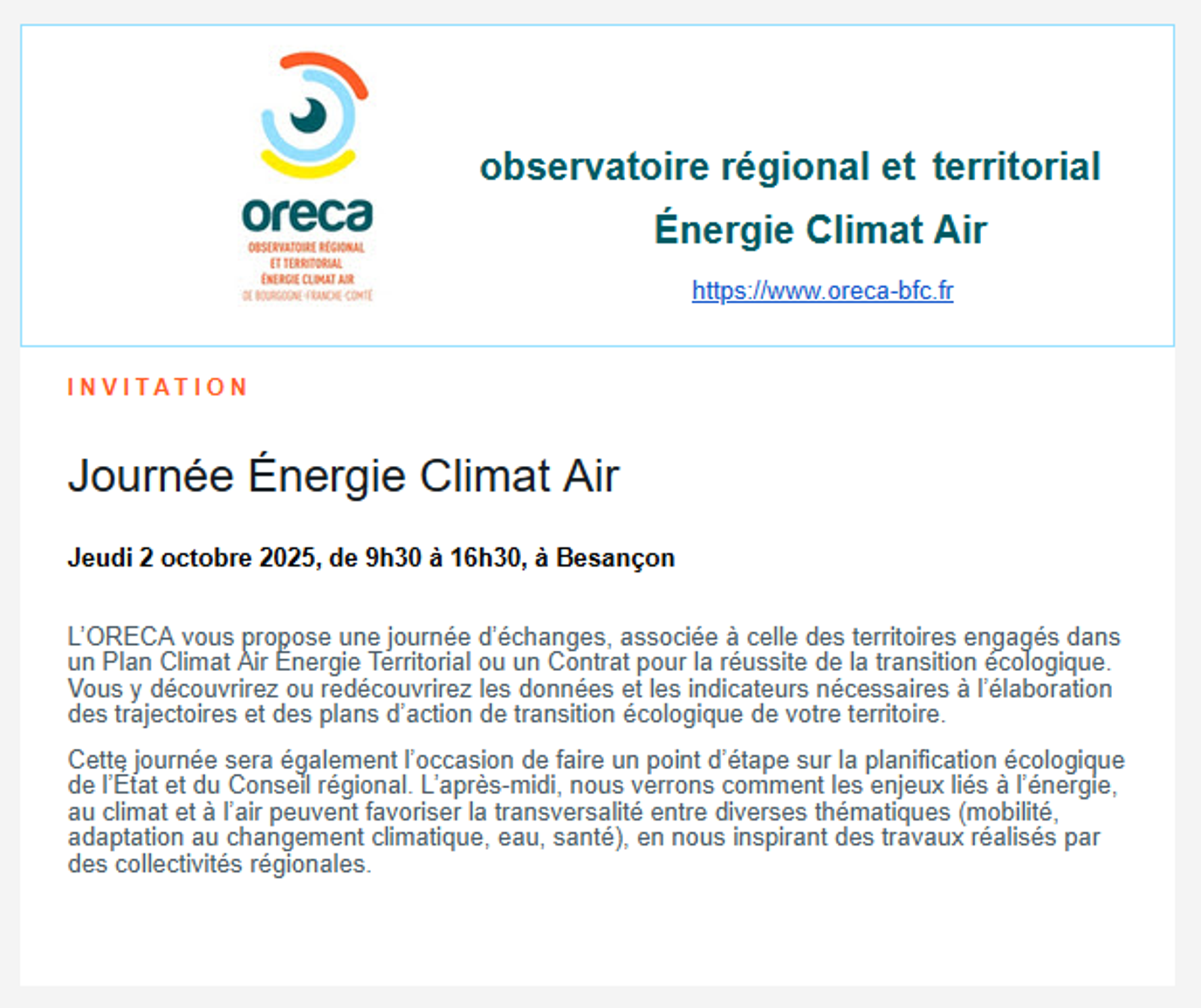 L'ORECA (Observatoire régional et territorial énergie-climat-air) vous propose une journée d’échanges, associée à celle des territoires engagés dans un Plan Climat Air Énergie Territorial ou un Contrat pour la réussite de la transition écologique. Vous y découvrirez ou redécouvrirez les données et les indicateurs nécessaires à l’élaboration des trajectoires et des plans d’action de transition écologique de votre territoire.