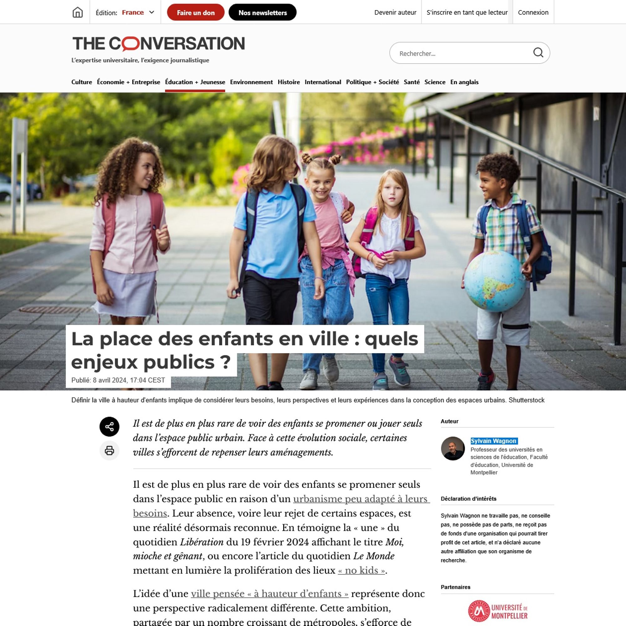 Ces propos sont repris de l’article de Sylvain Wagnon « La place des enfants en ville : Quels enjeux publics ? » pour le site « The Conversation » publié le 8 avril 2024