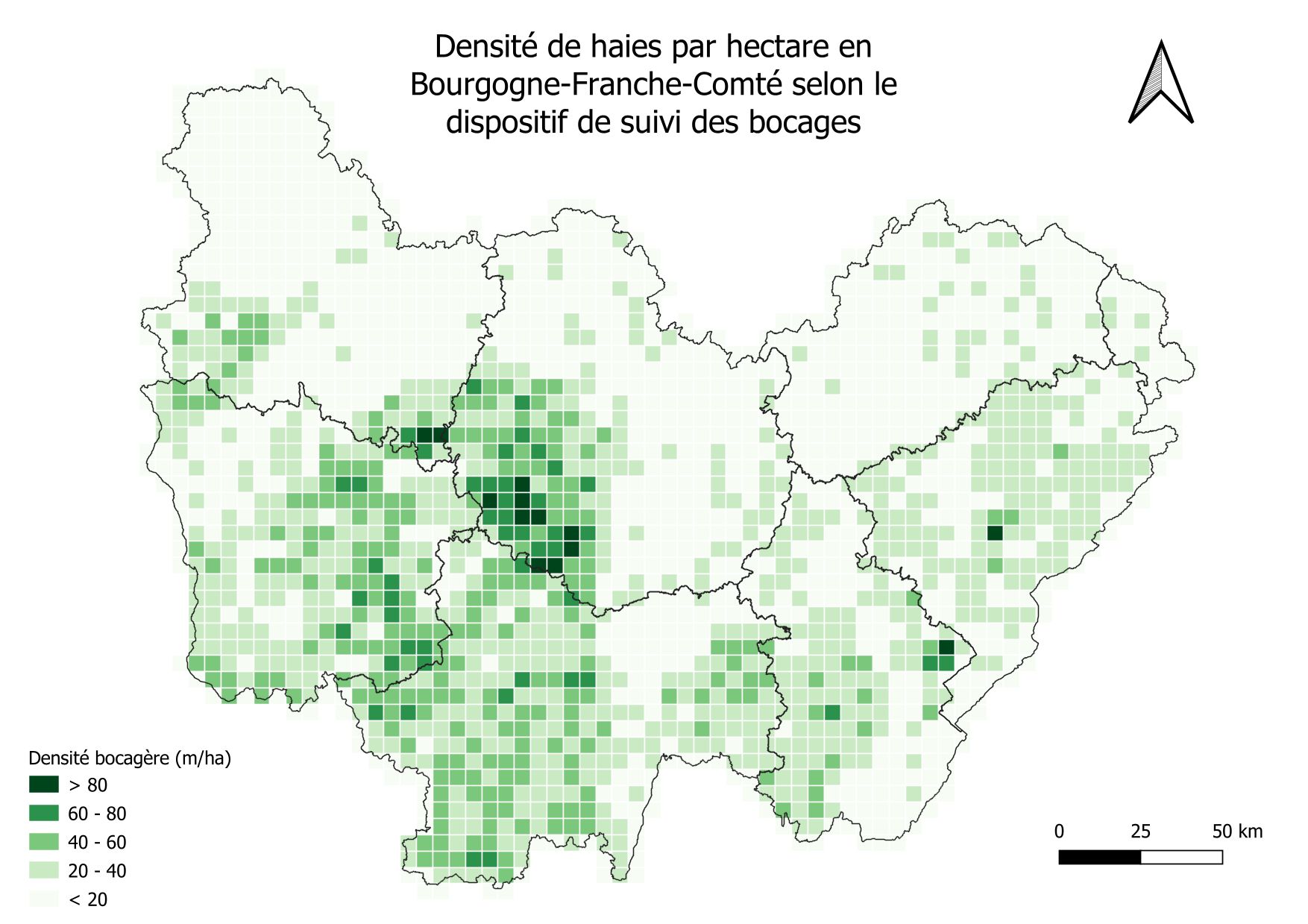 Pourtant, depuis 1950, 70 % des haies ont disparu des bocages français et continuent de diminuer. Ce phénomène n’a pas épargné le bocage de Bourgogne-Franche-Comté. Le linéaire de haies champêtres en Bourgogne a diminué de 42 % sur la période 1940-2013 même s’il représente encore un réseau de près de 115 000 kms.