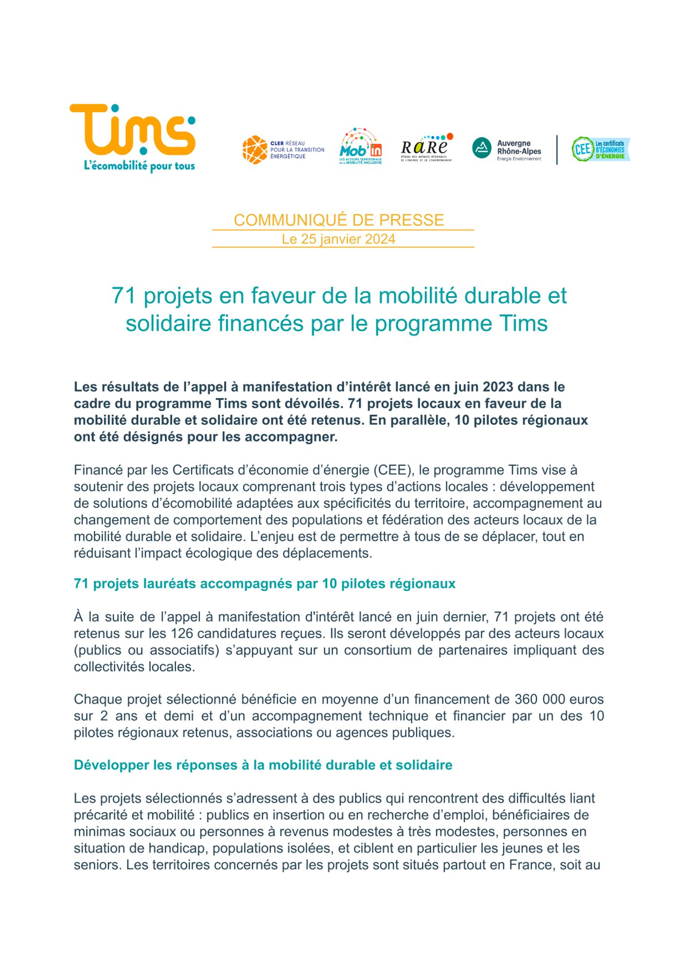Les résultats de l’appel à manifestation d’intérêt lancé en juin 2023 dans le cadre du programme Tims ont été dévoilés le 25 janvier dernier. 71 projets locaux en faveur de la mobilité durable et solidaire ont été retenus, dont 6 en Bourgogne-Franche-Comté.