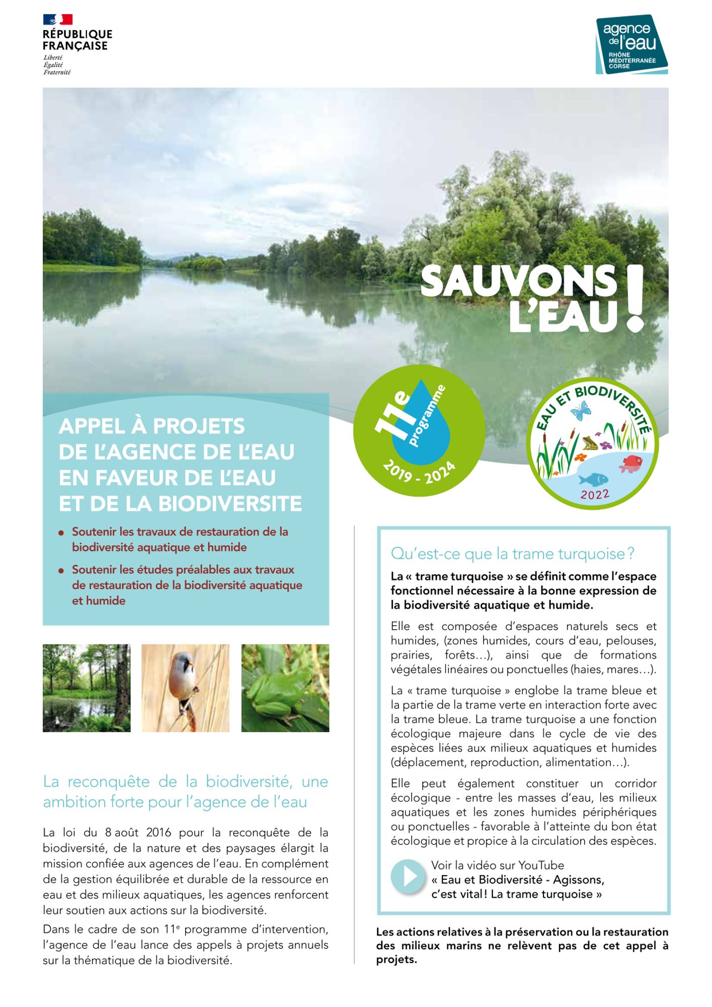 Dans le cadre de son 11e programme d’intervention, l’agence de l’eau Rhône-Méditerranée-Corse lance des appels à projets annuels sur la thématique de la biodiversité. L'appel à projet Eau et biodiversité vise à soutenir les projets de restauration de la biodiversité aquatique et humide et les études préalables aux travaux de restauration.