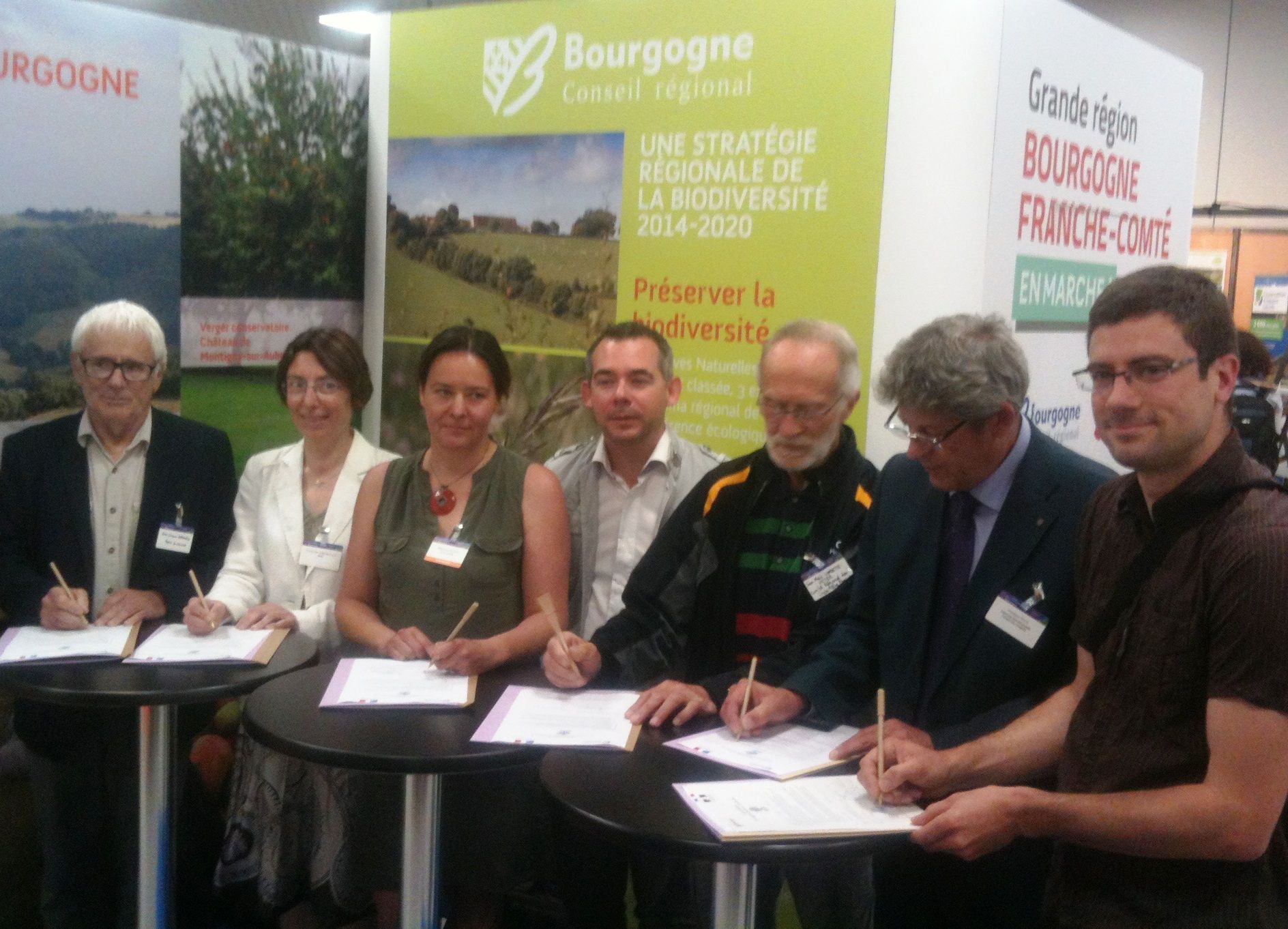 Photo : Six des signataires de la charte d'adhésion à la SRB, sur le stand du conseil régional de Bourgogne et en compagnie du conseiller régional Stephan Woynaroski. De gauche à droite : Jean Esmonin, maire de Chenôve ; Françoise Simon-Plas, présidente de l'INRA Dijon ; Stéphanie Modde, adjointe au maire de Dijon déléguée à l'écologie urbaine ; Jean-Marie Combette-Peter, Club alpin français ; Philippe Riva, UNICEM Bourgogne Franche-Comté ; Aurélien Trioux, commune de Bretigny (21).