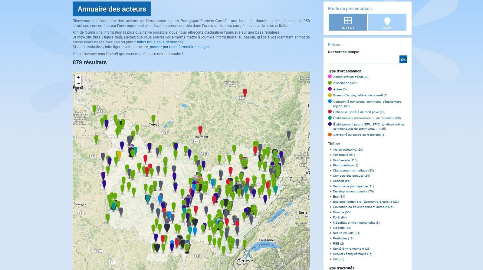L’annuaire des acteurs de l’environnement existe depuis déjà de nombreuses années. Il vient d’être rafraîchi et enrichi : il est maintenant composé de 880 fiches-acteurs. Un moteur de recherche thématique permet de trouver facilement une association ou tout acteur public, suivant les compétences et les domaines d’activités recherchés, ou encore le secteur géographique à l’aide d’une carte interactive.