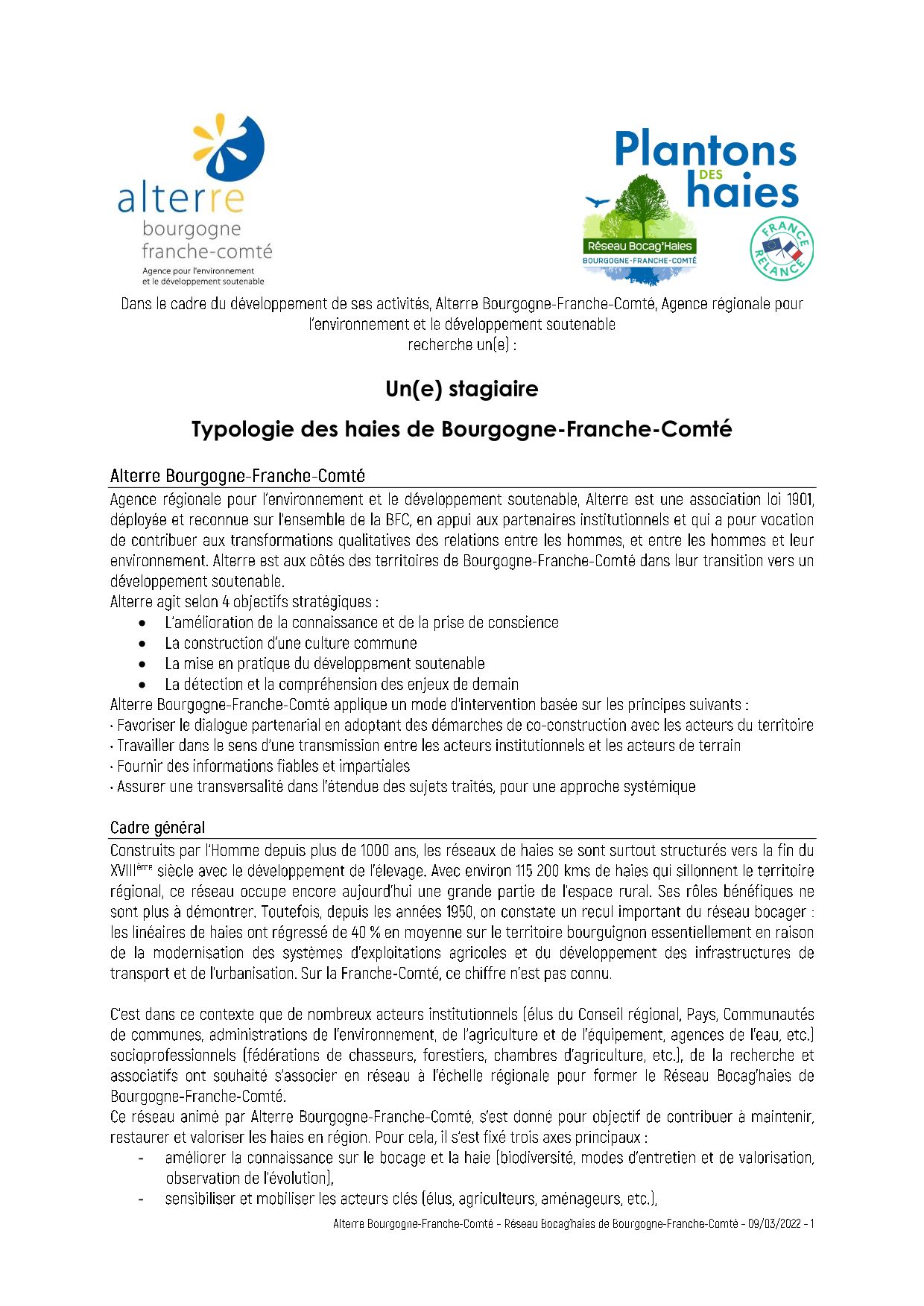 Alterre anime le réseau Bocag'Haies qui a pour objectif de contribuer à maintenir, restaurer et valoriser les haies en région. Dans le cadre de ce réseau, Alterre souhaite renouveler un travail d'analyse, de caractérisation et de cartographie des haies, mené en Bourgogne en 2013, sur la partie franc-comtoise de la région.