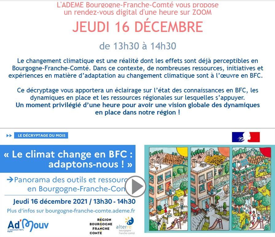 Le prochain "décrytage du mois" de l'ADEME Bourgogne-Franche-Comté portera sur l'adaptation au changement climatique en Bourgogne-Franche-Comté. Il apportera un éclairage sur l'état des connaissances, les dynamiques en place et les ressources régionales sur lesquelles s'appuyer. Alterre interviendra aux côtés de l'ADEME et la Région Bourgogne-Franche-Comté, pour s'adresser aux territoires et aux acteurs relais, le jeudi 16 décembre de 13h30 à 14h30.