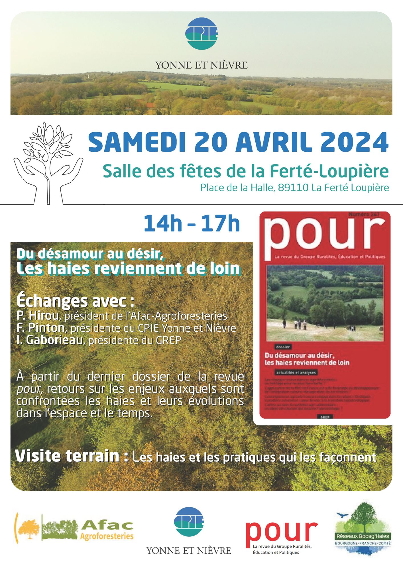 📢 Le samedi 20 avril, le CPIE Yonne et Nièvre - partenaire du Réseau Bocag'Haies - propose, après son Assemblée générale, une après-midi d'échanges autour du bocage et des haies, à l'occasion de la sortie du dernier numéro de la revue Pour et son dossier "Du désamour au désir, les haies reviennent de loin", suivie d'une visite terrain.