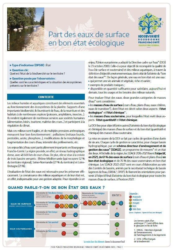 L’indicateur “Part des eaux de surface en bon état écologique” renseigne sur l’état écologique des masses d’eau de surface de Bourgogne-Franche-Comté et sur le travail restant à accomplir, pour atteindre l’objectif de « bon état des eaux », identifié dans le cadre de la Directive cadre sur l'eau.