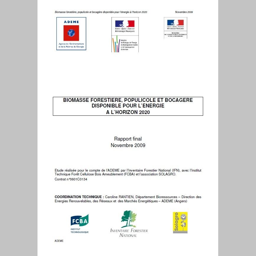 Cette étude réalisée par le groupement IFN / Solagro / FCBA pour le compte de l’ADEME, a pour objectif de quantifier le plus exhaustivement possible la biomasse ligneuse effectivement disponible pour l’énergie en France métropolitaine à l’horizon 2020, issue majoritairement des forêts en massif et des boisements agricoles (bosquets, peupleraies, haies et alignements).